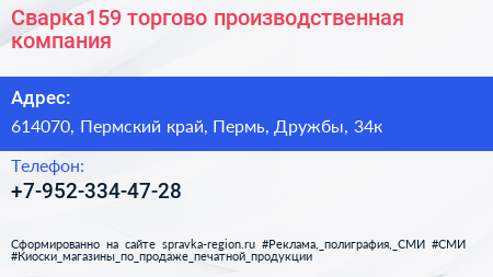 Сварка159, торгово-производственная компания по адресу 614070, Пермский край, Пермь, Дружбы, 34к в дальнейшем Организация, размещена в следующих категориях: