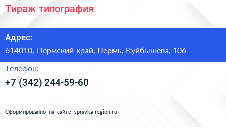 Тираж, типография по адресу 614010, Пермский край, Пермь, Куйбышева, 106 в дальнейшем Организация, размещена в следующих категориях: