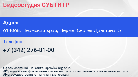 Видеостудия СУБТИТР по адресу 614068, Пермский край, Пермь, Сергея Данщина, 5 в дальнейшем Организация, размещена в следующих категориях: