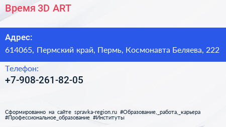 Время 3D-ART по адресу 614065, Пермский край, Пермь, Космонавта Беляева, 222 в дальнейшем Организация, размещена в следующих категориях: