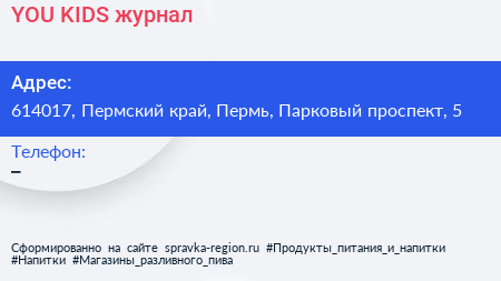 YOU & KIDS, журнал по адресу 614017, Пермский край, Пермь, Парковый проспект, 5 в дальнейшем Организация, размещена в следующих категориях: