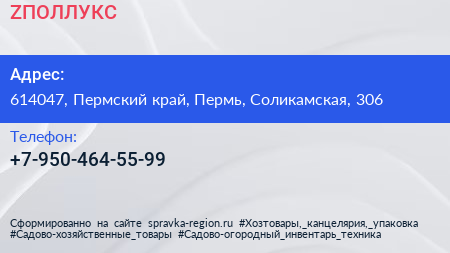 ZПОЛЛУКС по адресу 614047, Пермский край, Пермь, Соликамская, 306 в дальнейшем Организация, размещена в следующих категориях: