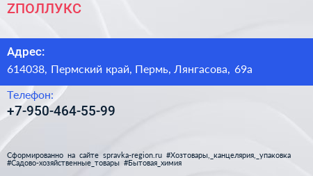 ZПОЛЛУКС по адресу 614038, Пермский край, Пермь, Лянгасова, 69а в дальнейшем Организация, размещена в следующих категориях: