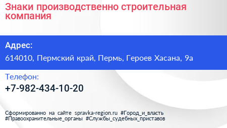 Знаки, производственно-строительная компания по адресу 614010, Пермский край, Пермь, Героев Хасана, 9а в дальнейшем Организация, размещена в следующих категориях: