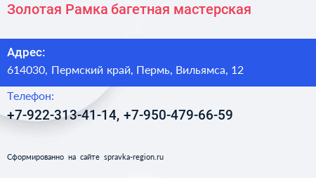 Золотая Рамка, багетная мастерская по адресу 614030, Пермский край, Пермь, Вильямса, 12 в дальнейшем Организация, размещена в следующих категориях: