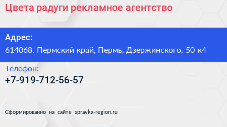 Цвета радуги, рекламное агентство по адресу 614068, Пермский край, Пермь, Дзержинского, 50 к4 в дальнейшем Организация, размещена в следующих категориях: