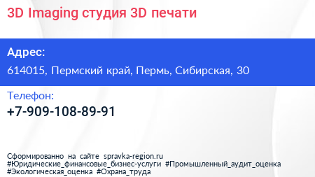 3D Imaging, студия 3D-печати по адресу 614015, Пермский край, Пермь, Сибирская, 30 в дальнейшем Организация, размещена в следующих категориях: