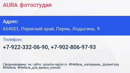 AURA, фотостудия по адресу 614021, Пермский край, Пермь, Лодыгина, 9 в дальнейшем Организация, размещена в следующих категориях: