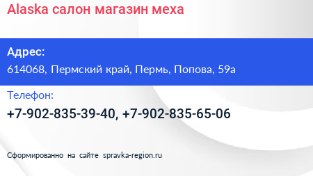 Alaska, салон-магазин меха по адресу 614068, Пермский край, Пермь, Попова, 59а в дальнейшем Организация, размещена в следующих категориях: