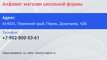 Алфавит, магазин школьной формы по адресу 614031, Пермский край, Пермь, Докучаева, 42Б в дальнейшем Организация, размещена в следующих категориях: