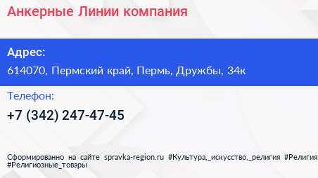 Анкерные Линии, компания по адресу 614070, Пермский край, Пермь, Дружбы, 34к в дальнейшем Организация, размещена в следующих категориях: