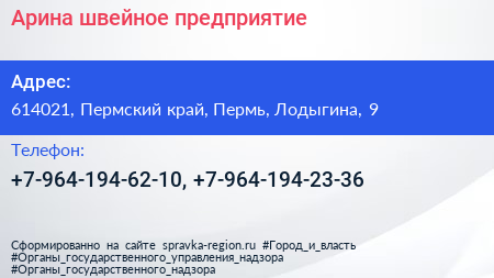 Арина, швейное предприятие по адресу 614021, Пермский край, Пермь, Лодыгина, 9 в дальнейшем Организация, размещена в следующих категориях: