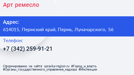 Арт-ремесло по адресу 614015, Пермский край, Пермь, Луначарского, 56 в дальнейшем Организация, размещена в следующих категориях:
