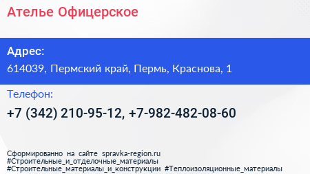 Ателье Офицерское по адресу 614039, Пермский край, Пермь, Краснова, 1 в дальнейшем Организация, размещена в следующих категориях: