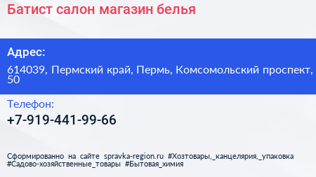 Батист, салон-магазин белья по адресу 614039, Пермский край, Пермь, Комсомольский проспект, 50 в дальнейшем Организация, размещена в следующих категориях: