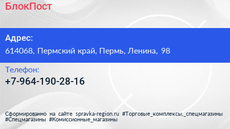 БлокПост по адресу 614068, Пермский край, Пермь, Ленина, 98 в дальнейшем Организация, размещена в следующих категориях: