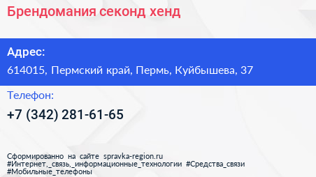 Брендомания, секонд-хенд по адресу 614015, Пермский край, Пермь, Куйбышева, 37 в дальнейшем Организация, размещена в следующих категориях: