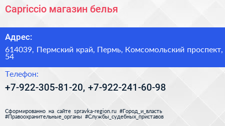 Capriccio, магазин белья по адресу 614039, Пермский край, Пермь, Комсомольский проспект, 54 в дальнейшем Организация, размещена в следующих категориях: