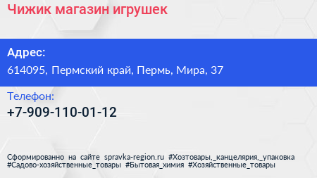 Чижик, магазин игрушек по адресу 614095, Пермский край, Пермь, Мира, 37 в дальнейшем Организация, размещена в следующих категориях: