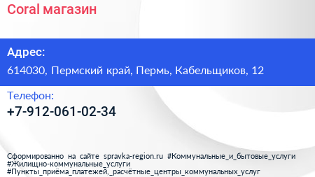 Coral, магазин по адресу 614030, Пермский край, Пермь, Кабельщиков, 12 в дальнейшем Организация, размещена в следующих категориях:
