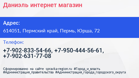 Даниэль, интернет-магазин по адресу 614051, Пермский край, Пермь, Юрша, 72 в дальнейшем Организация, размещена в следующих категориях: