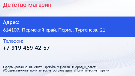 Детство, магазин по адресу 614107, Пермский край, Пермь, Тургенева, 21 в дальнейшем Организация, размещена в следующих категориях: