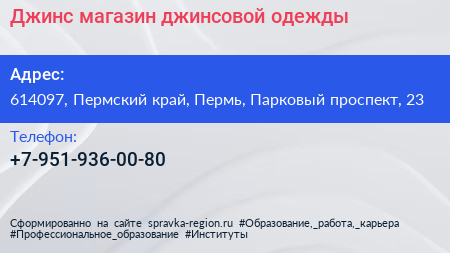 Джинс, магазин джинсовой одежды по адресу 614097, Пермский край, Пермь, Парковый проспект, 23 в дальнейшем Организация, размещена в следующих категориях: