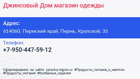 Джинсовый Дом, магазин одежды по адресу 614060, Пермский край, Пермь, Крупской, 35 в дальнейшем Организация, размещена в следующих категориях: