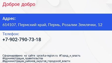 Доброе добро по адресу 614107, Пермский край, Пермь, Розалии Землячки, 12 в дальнейшем Организация, размещена в следующих категориях: