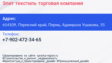 Элит-текстиль, торговая компания по адресу 614109, Пермский край, Пермь, Адмирала Ушакова, 55 в дальнейшем Организация, размещена в следующих категориях: