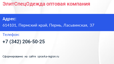 ЭлитСпецОдежда, оптовая компания по адресу 614101, Пермский край, Пермь, Ласьвинская, 37 в дальнейшем Организация, размещена в следующих категориях: