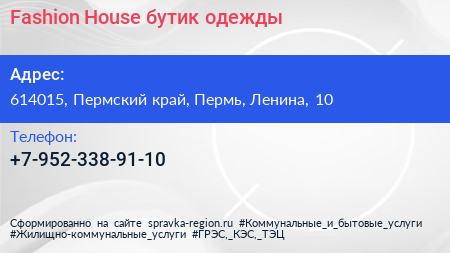 Fashion House, бутик одежды по адресу 614015, Пермский край, Пермь, Ленина, 10 в дальнейшем Организация, размещена в следующих категориях: