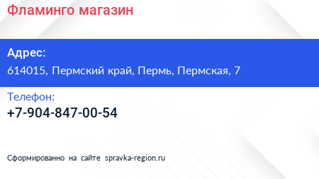 Фламинго, магазин по адресу 614015, Пермский край, Пермь, Пермская, 7 в дальнейшем Организация, размещена в следующих категориях: