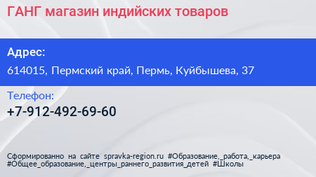 ГАНГ, магазин индийских товаров по адресу 614015, Пермский край, Пермь, Куйбышева, 37 в дальнейшем Организация, размещена в следующих категориях: