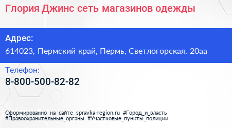 Глория Джинс, сеть магазинов одежды по адресу 614023, Пермский край, Пермь, Светлогорская, 20аа в дальнейшем Организация, размещена в следующих категориях: