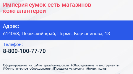 Империя сумок, сеть магазинов кожгалантереи по адресу 614068, Пермский край, Пермь, Борчанинова, 13 в дальнейшем Организация, размещена в следующих категориях: