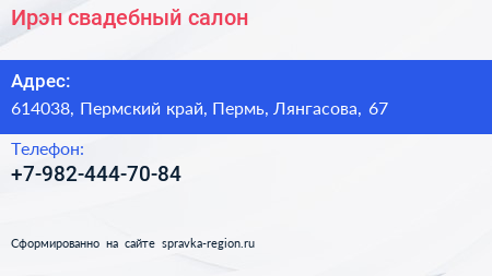 Ирэн, свадебный салон по адресу 614038, Пермский край, Пермь, Лянгасова, 67 в дальнейшем Организация, размещена в следующих категориях: