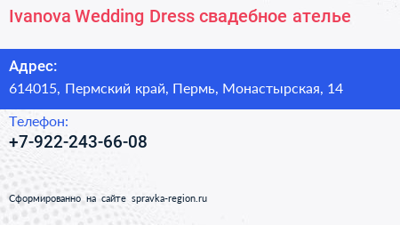 Ivanova Wedding Dress, свадебное ателье по адресу 614015, Пермский край, Пермь, Монастырская, 14 в дальнейшем Организация, размещена в следующих категориях: