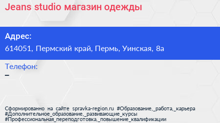 Jeans studio, магазин одежды по адресу 614051, Пермский край, Пермь, Уинская, 8а в дальнейшем Организация, размещена в следующих категориях:
