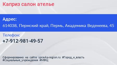 Каприз, салон-ателье по адресу 614038, Пермский край, Пермь, Академика Веденеева, 45 в дальнейшем Организация, размещена в следующих категориях:
