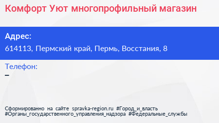 Комфорт Уют, многопрофильный магазин по адресу 614113, Пермский край, Пермь, Восстания, 8 в дальнейшем Организация, размещена в следующих категориях: