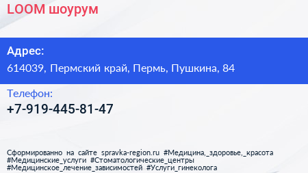 LOOM, шоурум по адресу 614039, Пермский край, Пермь, Пушкина, 84 в дальнейшем Организация, размещена в следующих категориях: