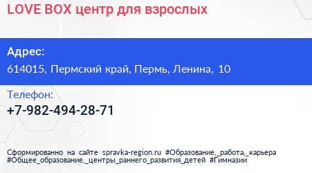 LOVE BOX, центр для взрослых по адресу 614015, Пермский край, Пермь, Ленина, 10 в дальнейшем Организация, размещена в следующих категориях: