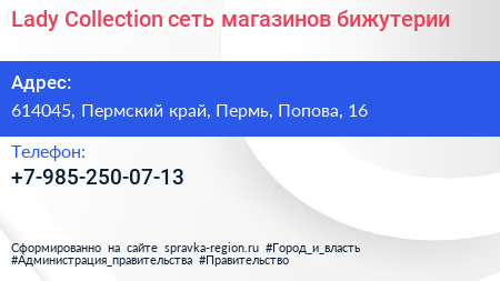 Lady Collection, сеть магазинов бижутерии по адресу 614045, Пермский край, Пермь, Попова, 16 в дальнейшем Организация, размещена в следующих категориях: