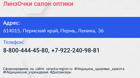 ЛинзОчки, салон оптики по адресу 614015, Пермский край, Пермь, Ленина, 36 в дальнейшем Организация, размещена в следующих категориях: