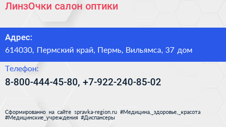 ЛинзОчки, салон оптики по адресу 614030, Пермский край, Пермь, Вильямса, 37 дом в дальнейшем Организация, размещена в следующих категориях: