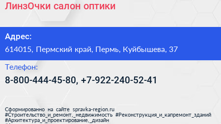 ЛинзОчки, салон оптики по адресу 614015, Пермский край, Пермь, Куйбышева, 37 в дальнейшем Организация, размещена в следующих категориях: