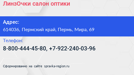 ЛинзОчки, салон оптики по адресу 614036, Пермский край, Пермь, Мира, 69 в дальнейшем Организация, размещена в следующих категориях: