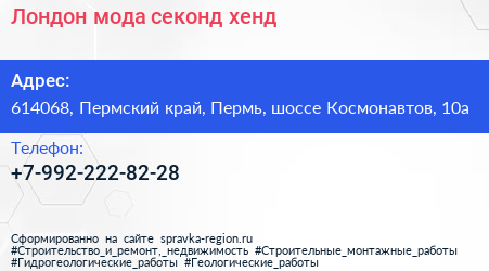 Лондон мода, секонд-хенд по адресу 614068, Пермский край, Пермь, шоссе Космонавтов, 10а в дальнейшем Организация, размещена в следующих категориях: