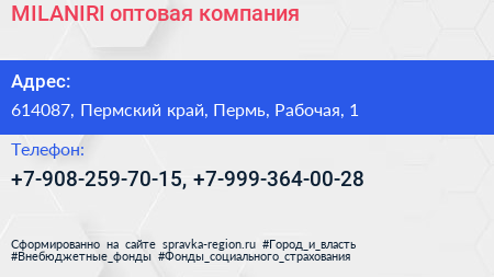 MILANIRI, оптовая компания по адресу 614087, Пермский край, Пермь, Рабочая, 1 в дальнейшем Организация, размещена в следующих категориях: